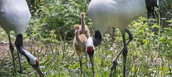 Nachwuchs bei Mandschurenkranichen im Zoo HeidelbergZwei Küken der Mandschurenkraniche sind im Heidelberger Zoo geschlüpft. Besucher können nun beobachten, wie der Nachwuchs den Eltern auf Schritt und Tritt folgt.