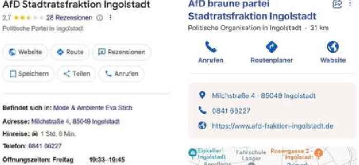 Von 19.33 Uhr bis 19.45 Uhr: Ingolstädter AfD-Büro hat „interessante Öffnungszeiten“Im Netz kursieren manipulierte Google- und Bing-Einträge zum AfD-Büro in Ingolstadt und sorgen für zahlreiche Kommentare. Denn sie sind eine eindeutige Anspielung auf die Nazi-Zeit.