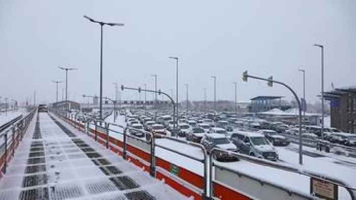 Abreisechaos auf der Nordseeinsel im dichten SchneefallStarker Andrang und Schnee führen zu langen Warteschlangen vor den Autozügen. Die abreisenden Inselbesucher sind trotzdem gut gelaunt.