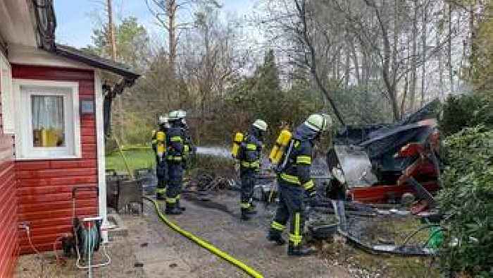 Rentnerin verschanzt sich bei Feuer in Holzhaus: Retter holen sie herausSchuppen stand in hellen Flammen, schwarze Rauchwolke über dem Gelände: Idyllisches Häuschen im Wald droht, Opfer der Flammen zu werden.