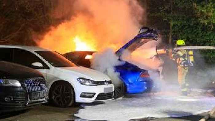 Wohnviertel bei Bremen: Drei Pkw stehen lichterloh in FlammenMitten in der Nacht brennen im Landkreis Verden drei Autos auf einem Parkplatz. Wie es dazu kam und wie groß der Schaden ist, bleibt unklar.