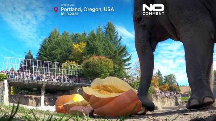 LESEN SIE MEHR : http://de.euronews.com/2025/10/17/elefanten-im-oregon-zoo-zermalmen-riesenkurbisse-zu-halloween Abonnieren Sie!