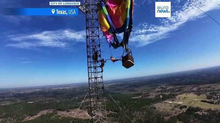 Zwei Menschen gerettet: Heißluftballon hängt in 274 Metern Höhe fest In Longview, Texas, retteten Einsatzkräfte zwei Menschen, deren Heißluftballon sich in 274 Metern Höhe in einem Funkmast verfing; nach stundenlangem Einsatz kamen beide vorsorglich ins Krankenhaus.